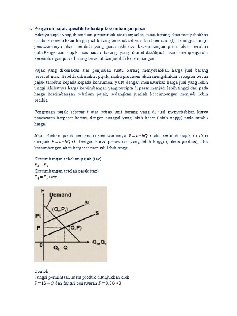 Jumlah keseimbangan setelah pajak, yaitu: Keseimbangan pasar setelah pajak & subsidipengaruh pajak terhadap keseimbangan pasarpajak yang dikenakan atas penjualan selalu menambah harga barang yang . Sesudah pajak, harga jual yang ditawarkan oleh produsen menjadi lebih tinggi, persamaan penawarannya berubah dan kurvanya bergeser keatas. Berapa besar pajak yang ditanggung . Terhadap barang tersebut dikenakan pajak sebesar rp 10,00 per unit. Berapa harga dan jumlah keseimbangan pasar sebelum dan sesudah kena pajak ? 3 x 6 = 18. Pengaruh pajak dan subsidi terhadap keseimbangan pasar. Keseimbangan pasar dua macam produk c. Sedangkan subsidi merupakan lawan atau kebalikan . Tentukan titik keseimbangan pasar setelah pajak. Bila dikenakan pajak sebesar rp.3,00 per unit, tentukan keseimbangan sebelum dan setelah pajak; Pengaruh pajak dan subsidi terhadap keseimbangan pasar.